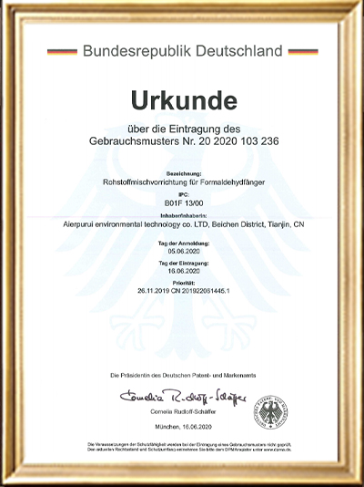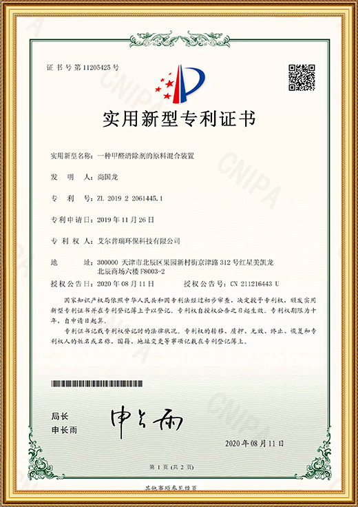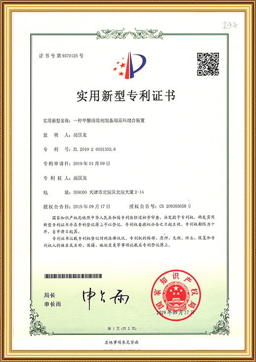 • 實(shí)用新型專利證書(shū)(一種甲醛清除劑的原料混合