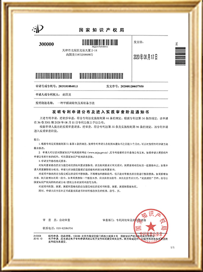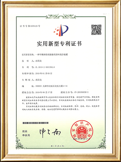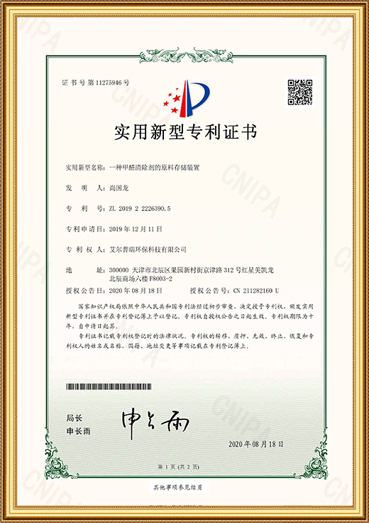 • 實(shí)用新型專利證書(shū)(一種甲醛清除劑的原料存儲(chǔ)