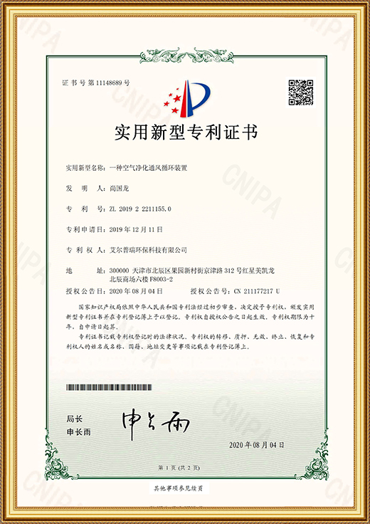 • 實(shí)用新型專利證書(shū)(一種空氣凈化通風(fēng)循環(huán)裝置