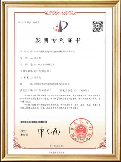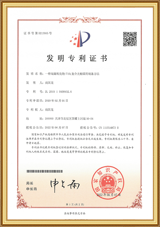 • 發(fā)明專利證書(shū)證書(shū)(一種高稿氧化物/Ti02復(fù)合光觸