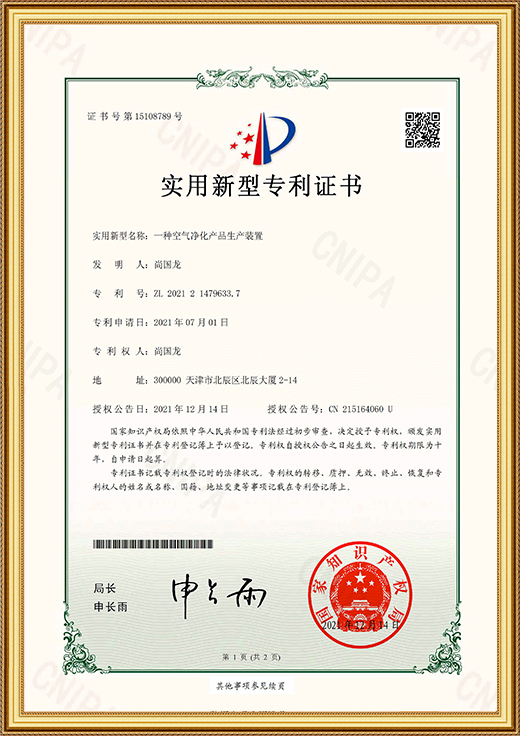 • 實(shí)用新型專利證書(shū)(一種空氣凈化產(chǎn)品生產(chǎn)裝置